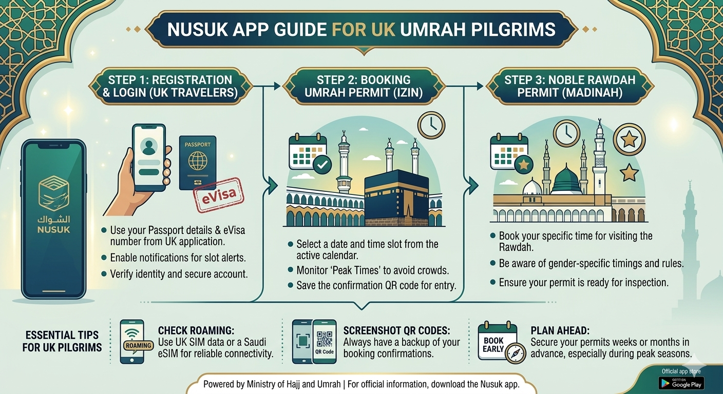 Nusuk Hajj vs. Nusuk Umrah: Note that for the Hajj 2026 season, British citizens must use the separate Nusuk Hajj portal (hajj.nusuk.sa) for package bookings, whereas Umrah can be managed on the mobile app.