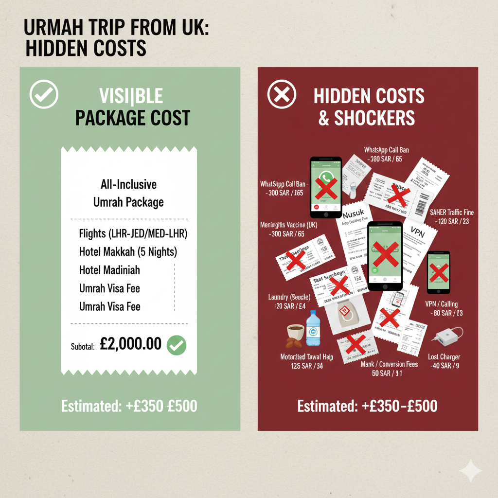 When planning your spiritual journey from London, Manchester, or Birmingham, the "all-inclusive" price on a brochure rarely tells the full story. For UK pilgrims in 2026, the shift toward a digital-first Saudi Arabia and the rising cost of local services mean that hidden costs can add significantly to your final bill.